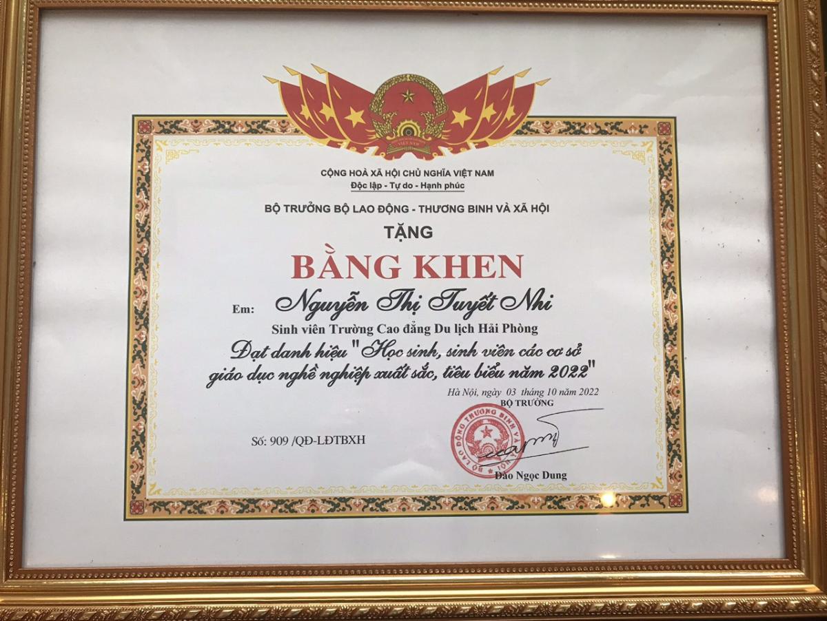 Sau 3 năm gắn bó và học tập tại Trường Cao đẳng Du Lịch Hải Phòng, em cảm thấy thực sự hạnh phúc và tự hào khi được nhận bằng khen sinh viên xuất sắc, tiêu biểu của Bộ Lao động, Thương binh và Xã Hội. Đồng hành cùng em không chỉ là gia đình bạn bè mà còn là các Quý thầy cô tại trường Cao đẳng Du lịch Hải Phòng - những người lái đó lặng thầm đưa chúng em tới bến bờ tri thức và giảng cho em những bài học hay.