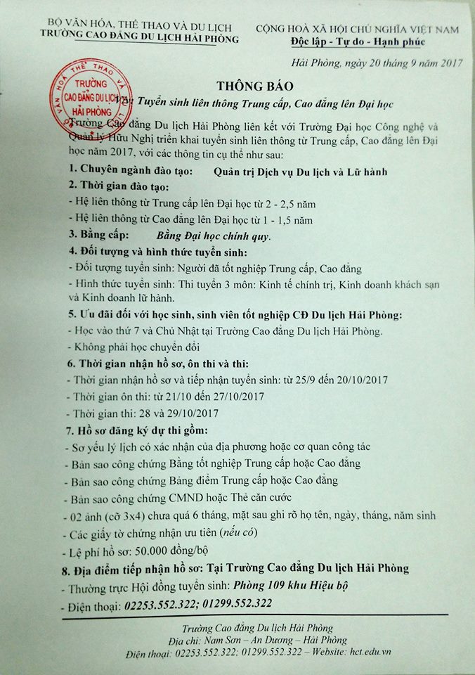 Trường Cao đẳng Du lịch Hải Phòng liên kết với Trường Đại học Công nghệ và Quản lý Hữu Nghị tuyển sinh liên thông trung cấp cao đẳng lên đại học năm 2017 - Sinh viên HCT được miễn học chuyển đổi - chi tiết xin xem file thông báo kèm theo