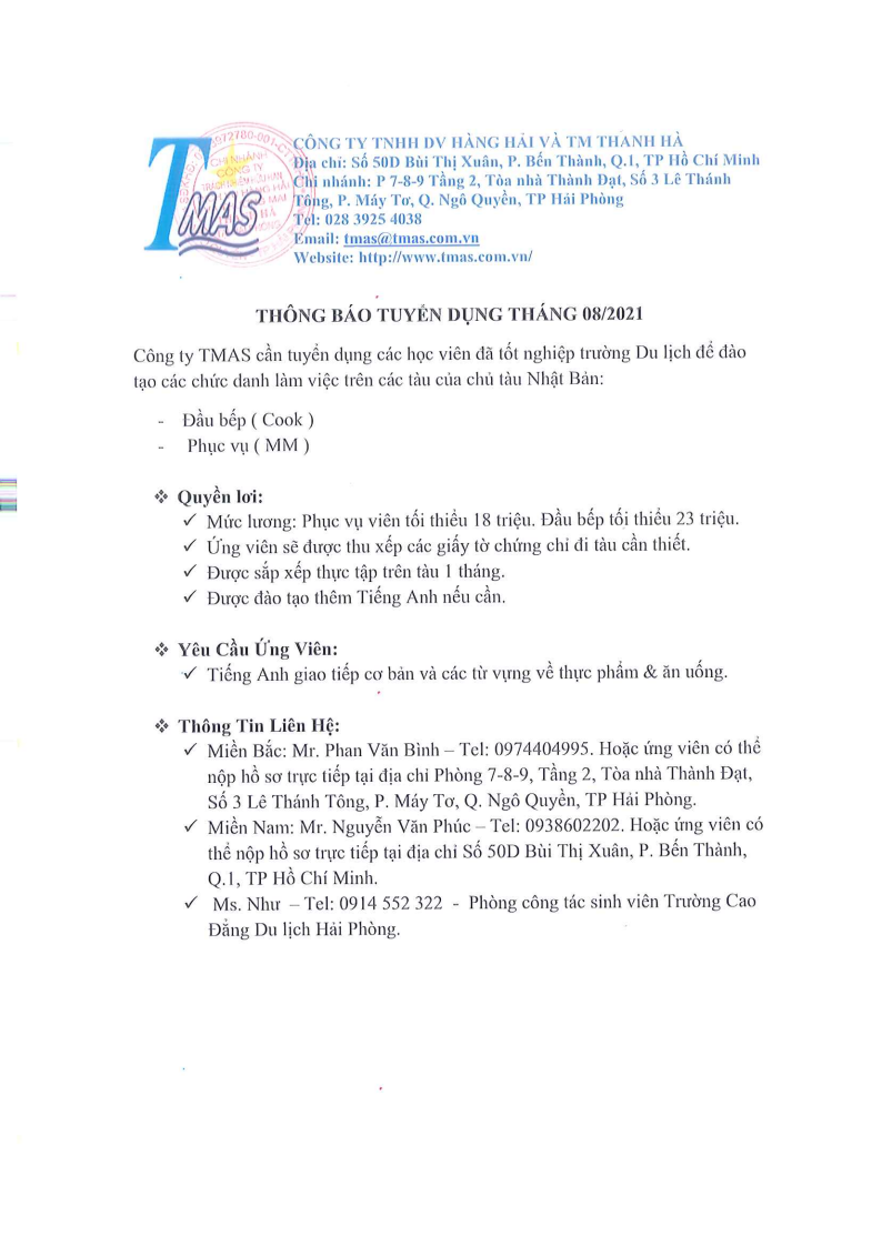 Công ty TNHH DV Hàng Hải và TM Thanh Hà tuyển dụng vị trí bếp, phục vụ trên tàu chủ tàu Nhật Bản.
