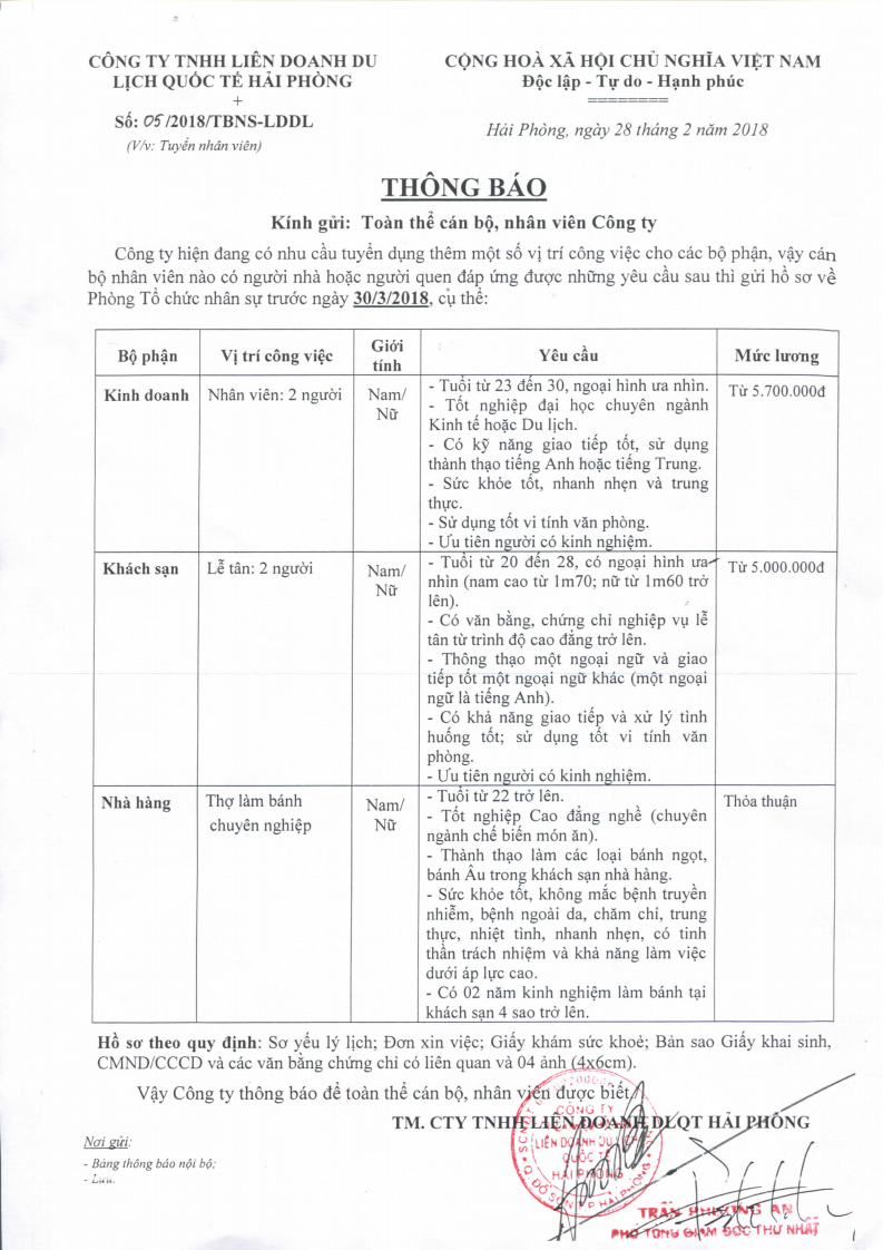 ĐT liên hệ: 0225 3864 888 Hoặc email: hanhikhue@gmail.com Đơn vị tuyển dụng CÔNG TY TNHH LIÊN DOANH DU LỊCH QUỐC TẾ HẢI PHÒNG