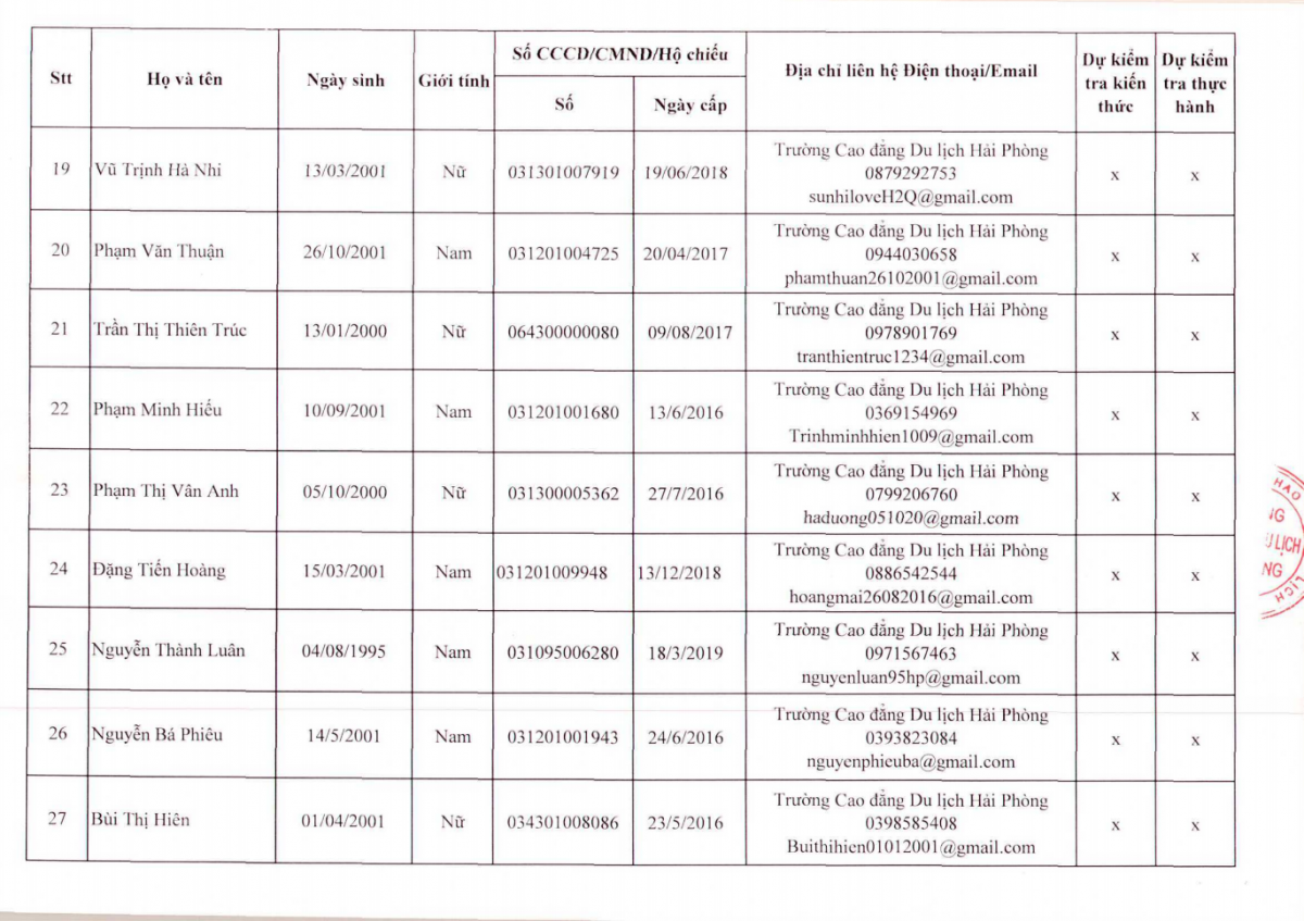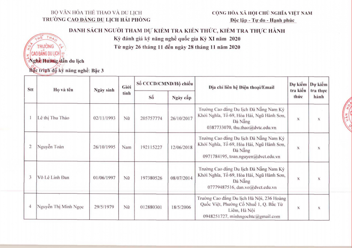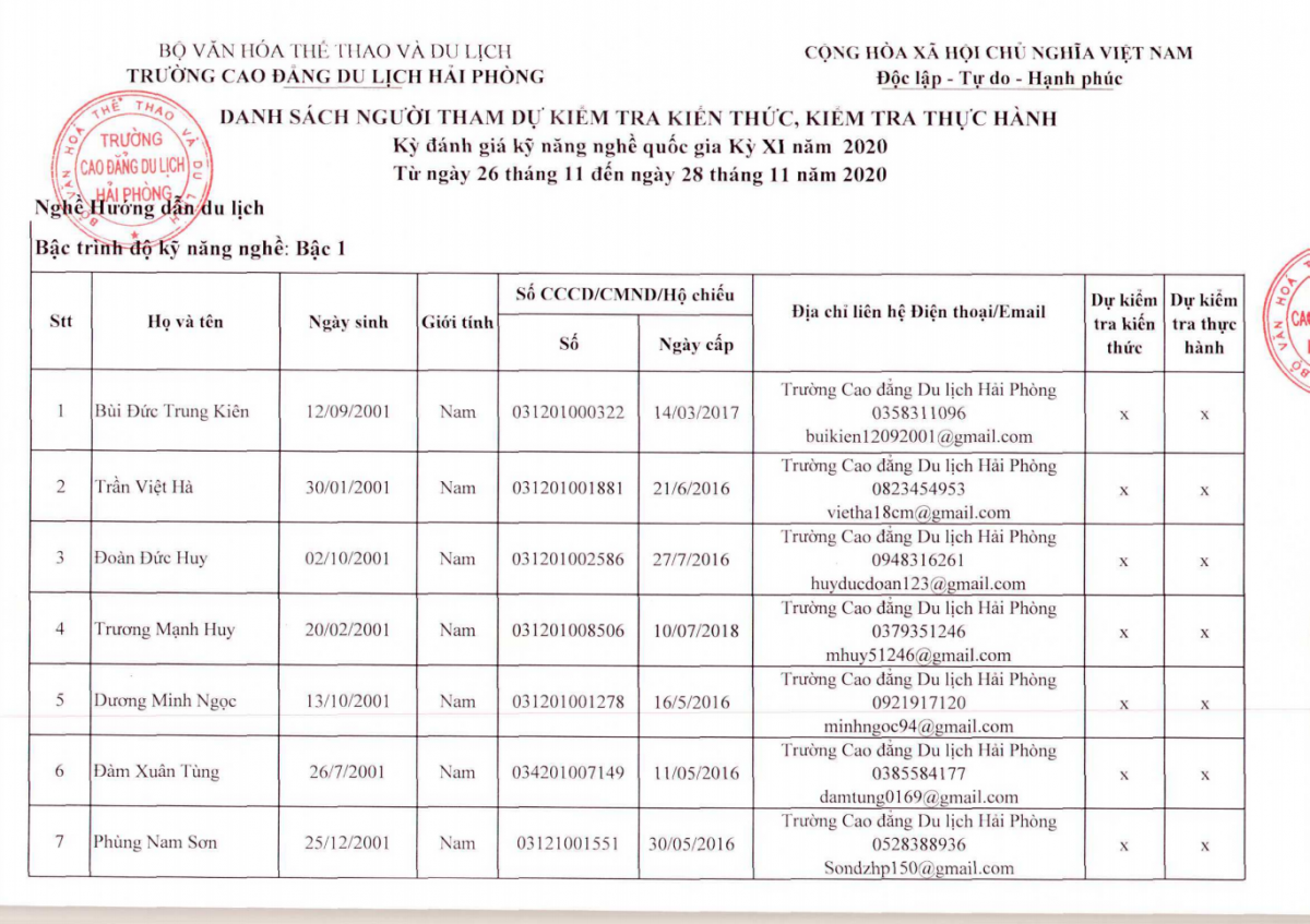Danh sách thí sinh tham dự kiểm tra kiến thức, kiểm tra thực hành nghề Hướng dẫn du lịch trình độ kỹ năng nghề bậc1; bậc 3; Kỳ đánh giá kỹ năng nghề Quốc gia ngày 26-28/11/2020