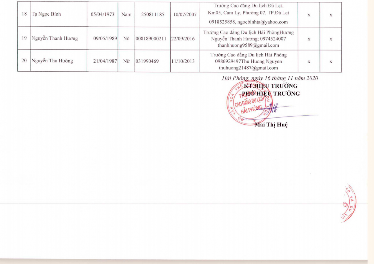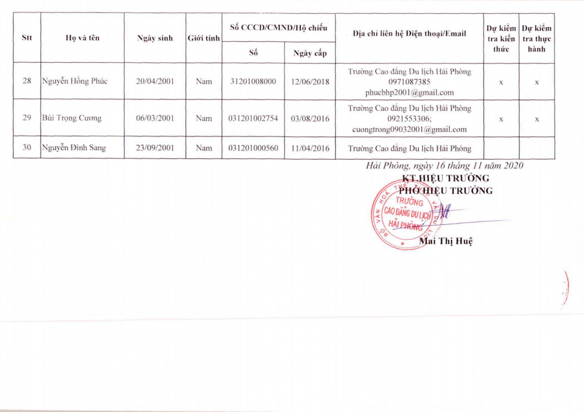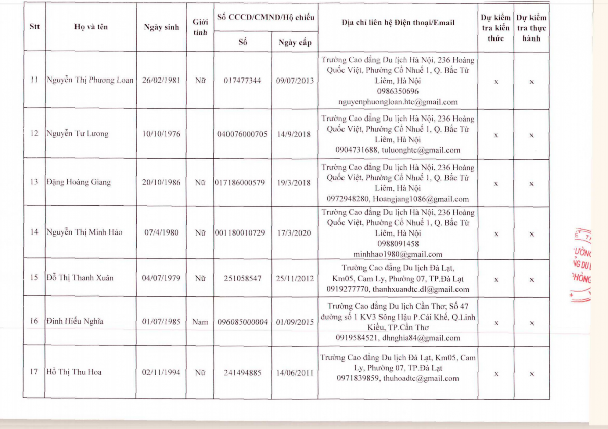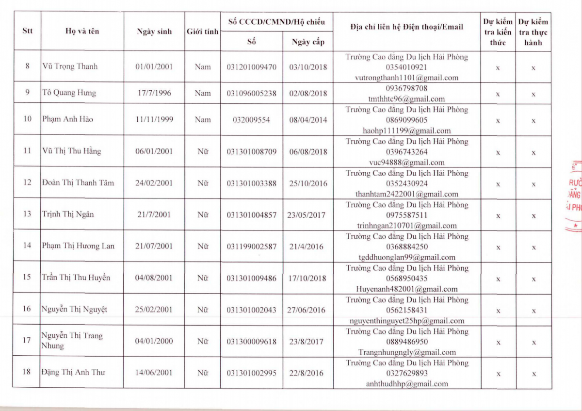 Danh sách thí sinh tham dự kiểm tra kiến thức, kiểm tra thực hành nghề Hướng dẫn du lịch trình độ kỹ năng nghề bậc1; bậc 3; Kỳ đánh giá kỹ năng nghề Quốc gia ngày 26-28/11/2020