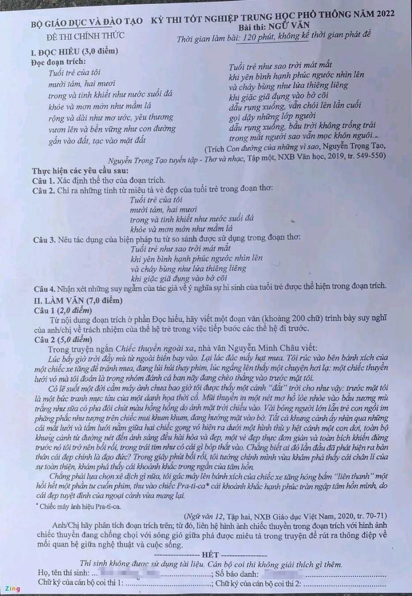 Đề thi môn Văn kỳ thi tốt nghiệp THPT 2022.
