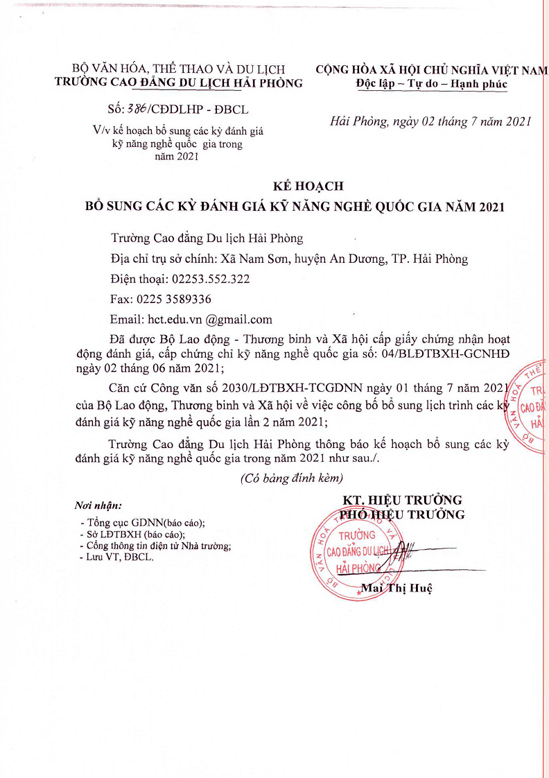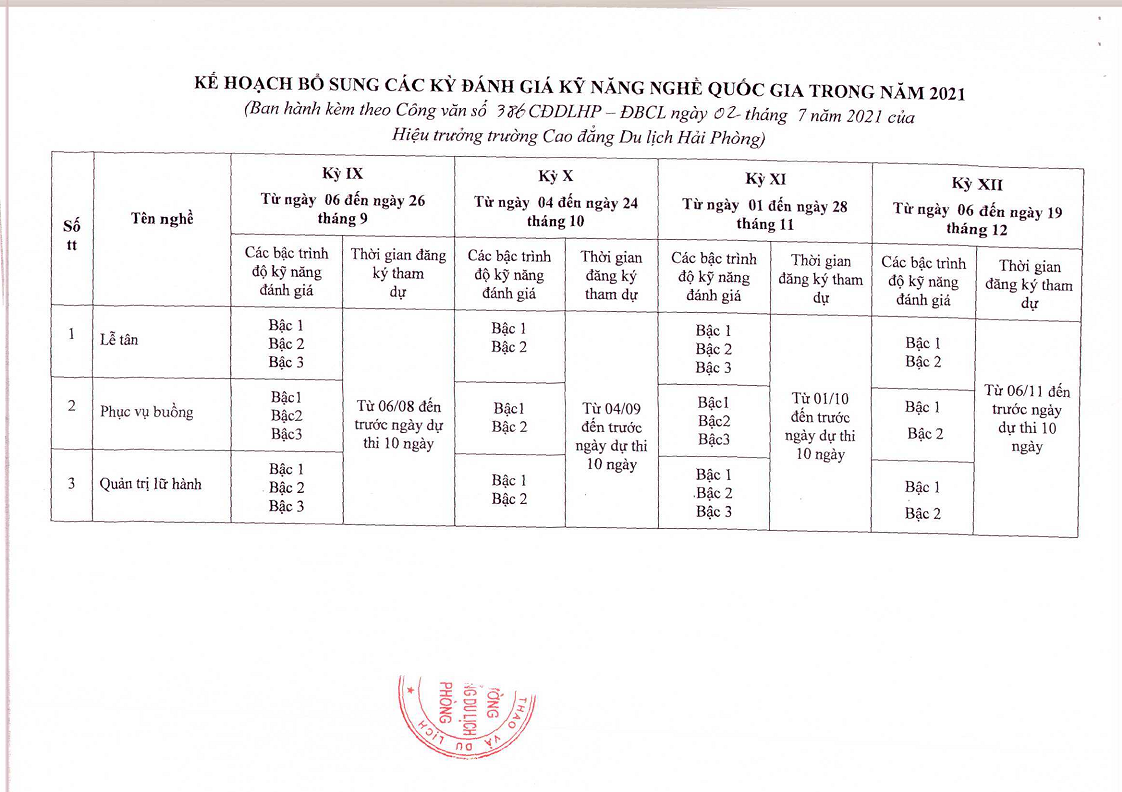 Kế hoạch bổ sung các kỳ đánh gia kỹ năng nghề Quốc gia năm 2021