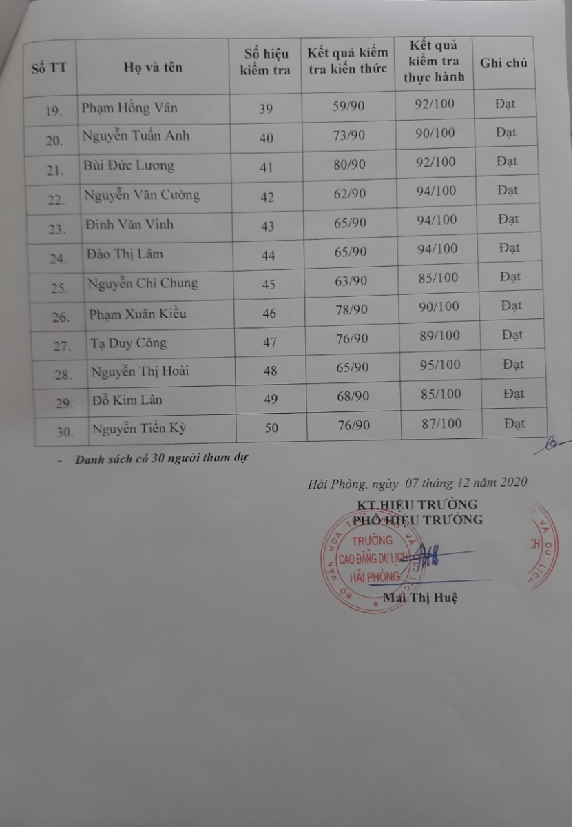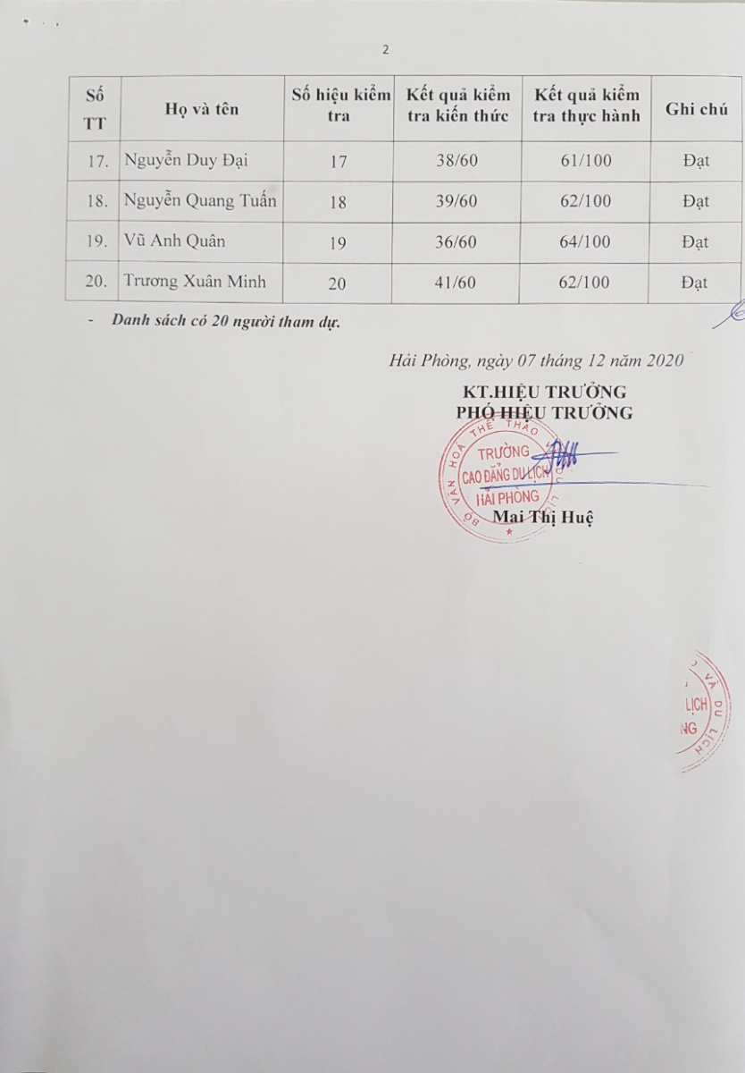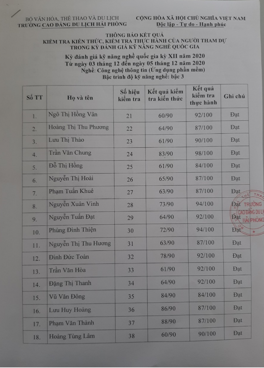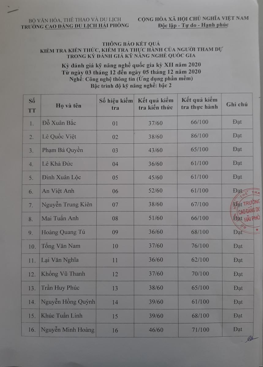 Kết quả kiểm tra kiến thức, kiểm tra thực hành kỳ đánh giá kỹ năng nghề Quốc gia kỳ XII năm 2020 nghề Công nghệ thông tin (ứng dụng phần mềm) bậc trình độ kỹ năng nghề: bậc 2; bậc 3.