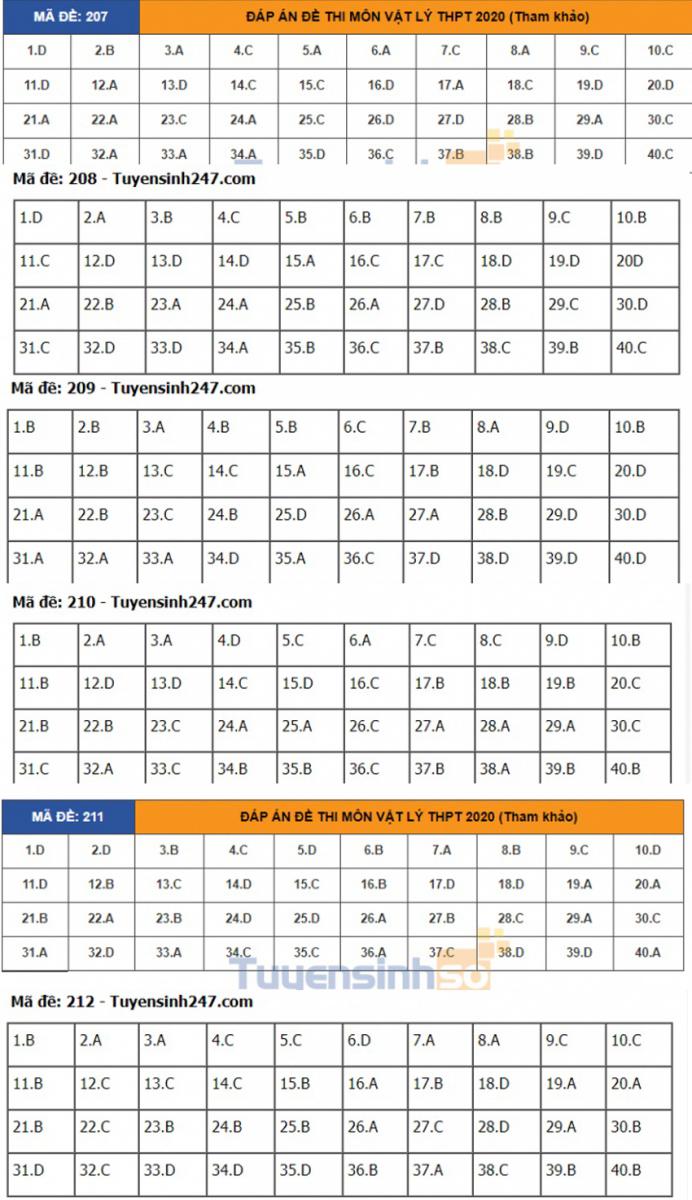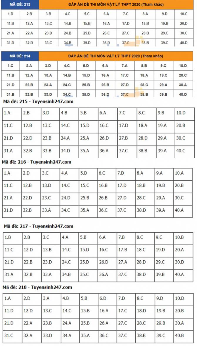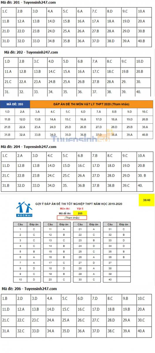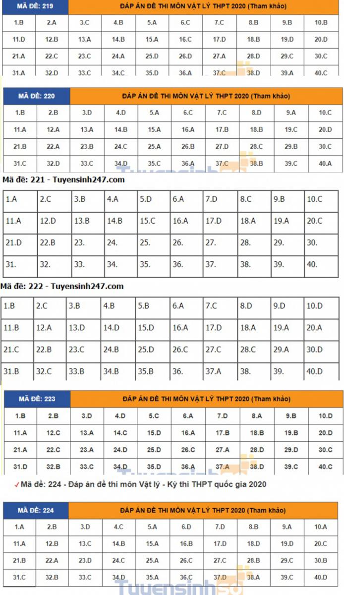 Đáp án tất cả các mã đề từ 201 đến 224 môn Vật lý THPT Quốc gia năm 2020 (Lưu ý: Đáp án trên chỉ mang tính chất tham khảo. Đáp án thi tốt nghiệp THPT 2020 chính thức sẽ được Bộ GD&ĐT công bố trong vài ngày tới).