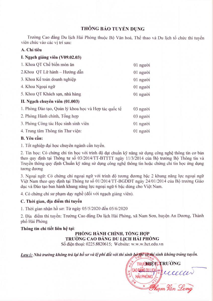Trường Cao đẳng Du lịch Hải Phòng thông báo tuyển dụng viên chức năm 2020