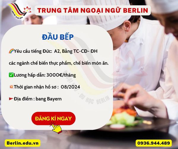 - Yêu cầu: Tiếng Đức A2 (tối thiểu); Bằng TC- CĐ- ĐH các ngành chế biến thực phẩm, chế biến món ăn.