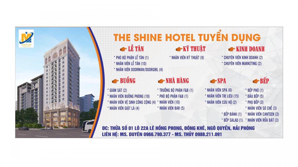 SHINE HOTEL tuyển dụng nhiều vị trí lễ tân, bếp, bar, bàn...