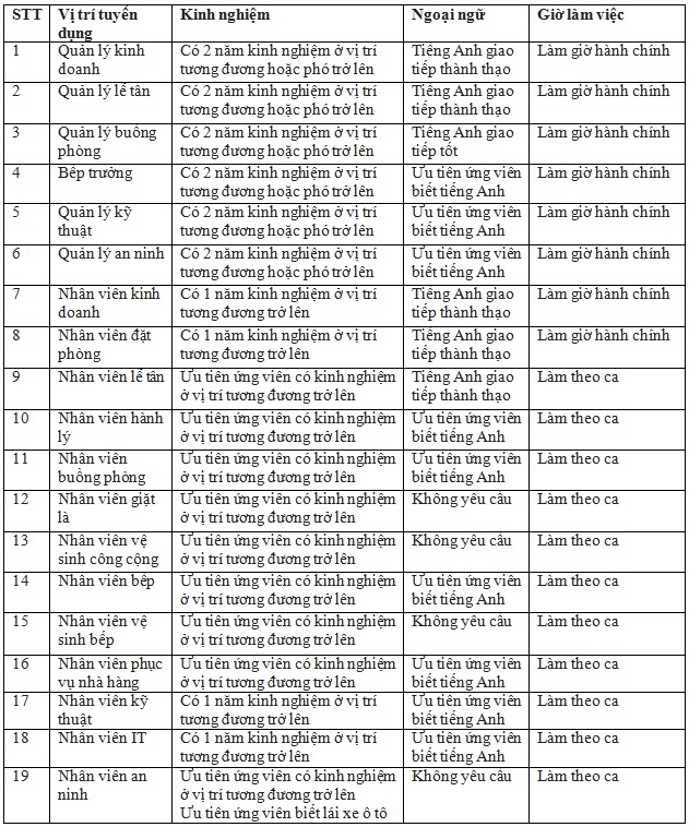 Tuyển dụng các vị trí quản lý, nhân viên lễ tân, buồng phòng, bếp...