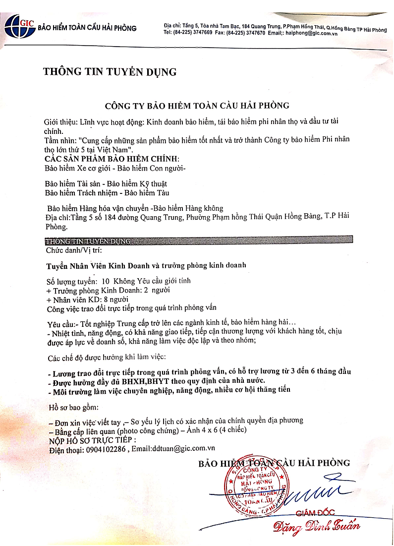 Tuyển dụng Trưởng Phòng, nhân viên kinh doanh