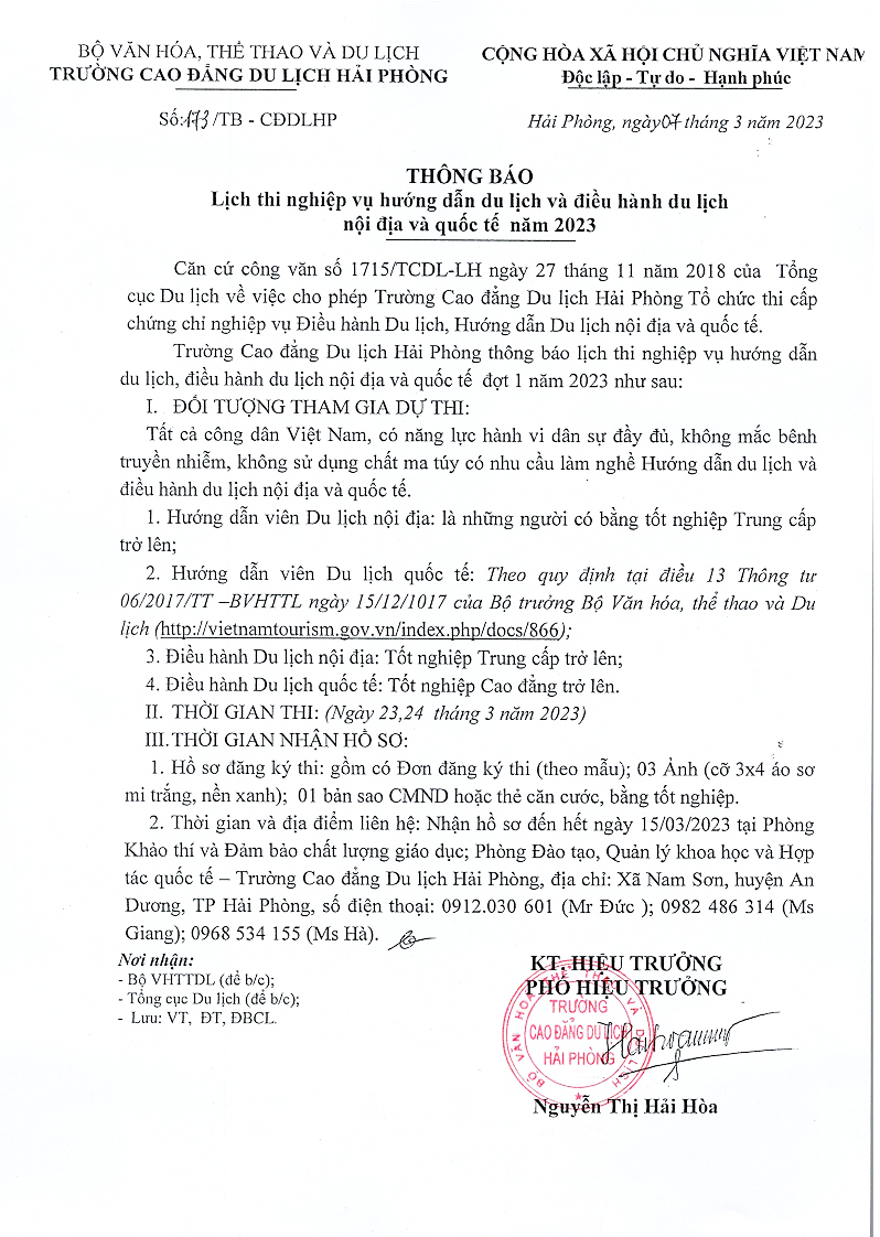 Thông báo lịch thi nghiệp vụ hướng dẫn du lịch và điều hành du lịch nội địa và quốc tế năm 2023