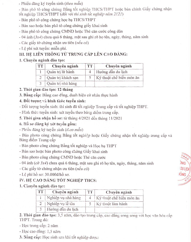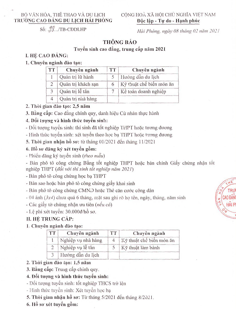 Trường Cao đẳng du lịch Hải Phòng thông báo tuyển sinh hệ cao đẳng, trung cấp chính quy, liên thông từ trung cấp lên cao đẳng năm 2021.