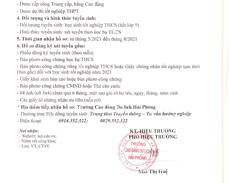 Mọi chi tiết xin liên hệ Ban tuyển sinh – Trường Cao đẳng Du lịch Hải Phòng.