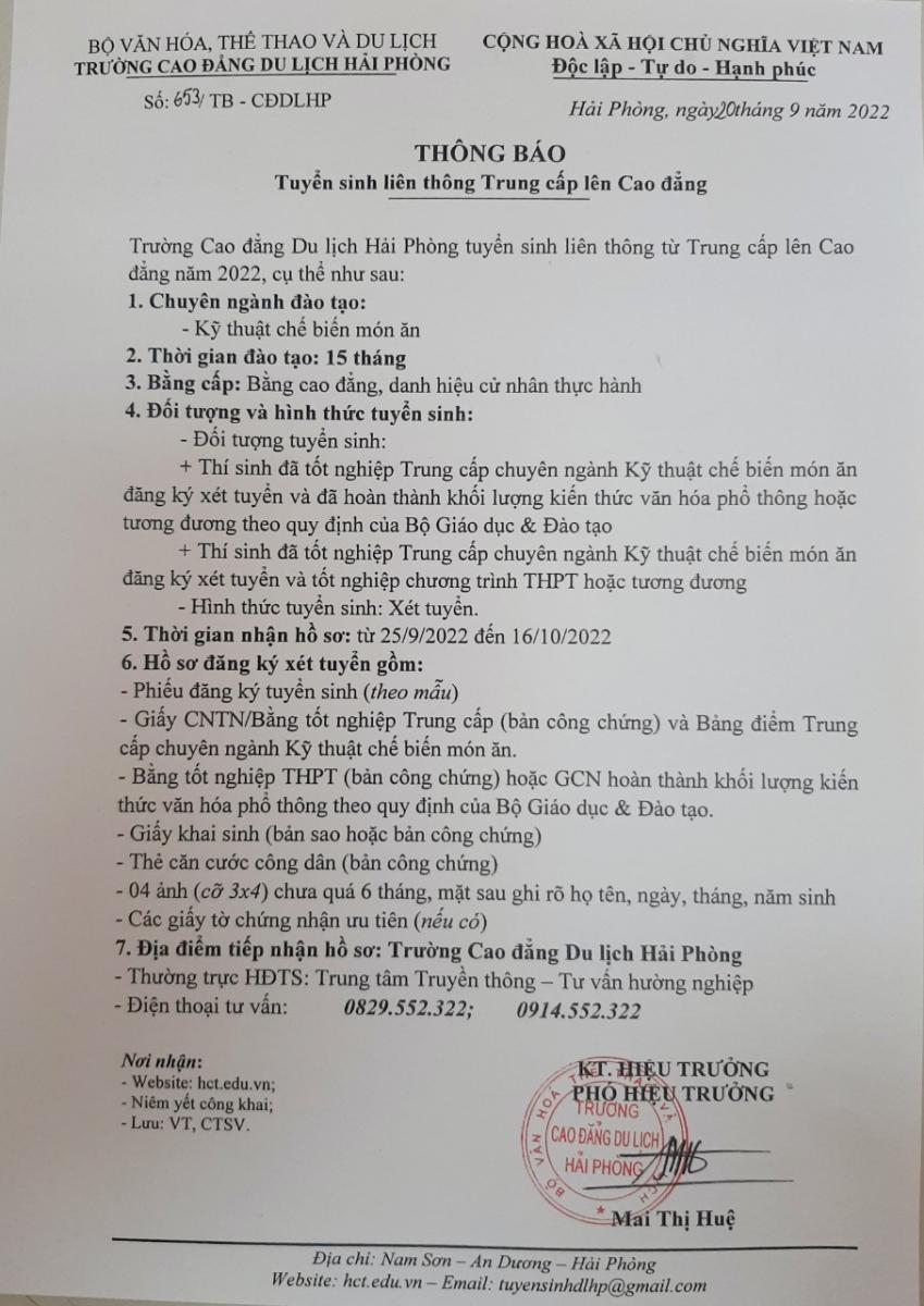 Thông báo tuyển sinh liên thông hệ Trung cấp lên Cao đẳng chính quy năm 2022