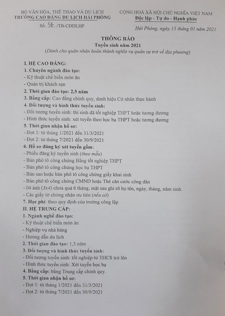 Thông báo tuyển sinh quân nhân xuất ngũ năm 2021