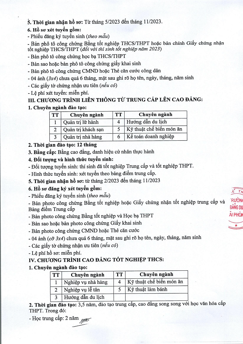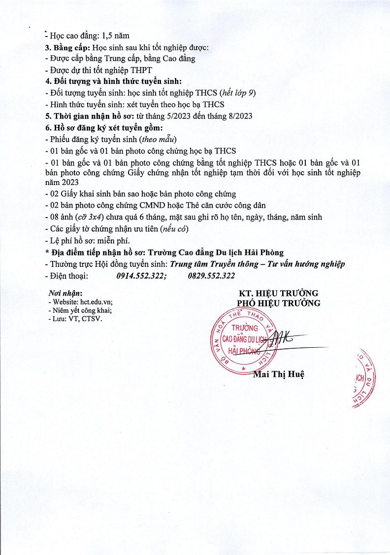 Ngày 14-02-2022, TRƯỜNG CAO ĐẲNG DU LỊCH HẢI PHÒNG - trường trọng điểm đào tạo cấp độ quốc tế, công bố phương án tuyển sinh năm 2023. Theo đó, Nhà trường tuyển sinh 10 ngành đào tạo Trình độ Cao đẳng; 06 ngành liên thông trình độ Trung cấp lên Cao đẳng và 05 ngành đào tạo chương trình Trung cấp kết hợp với học văn hóa trung học phổ thông (THPT).