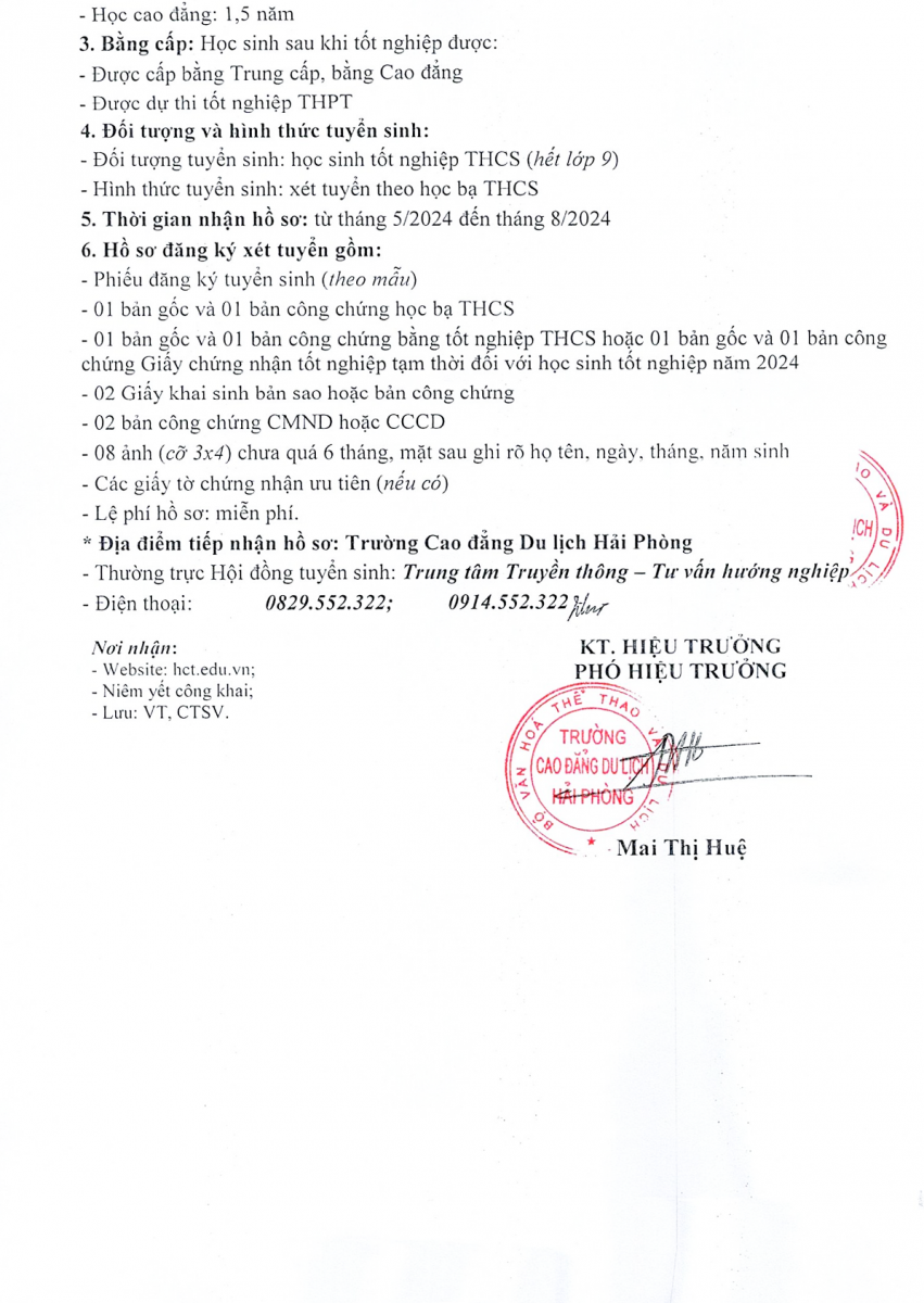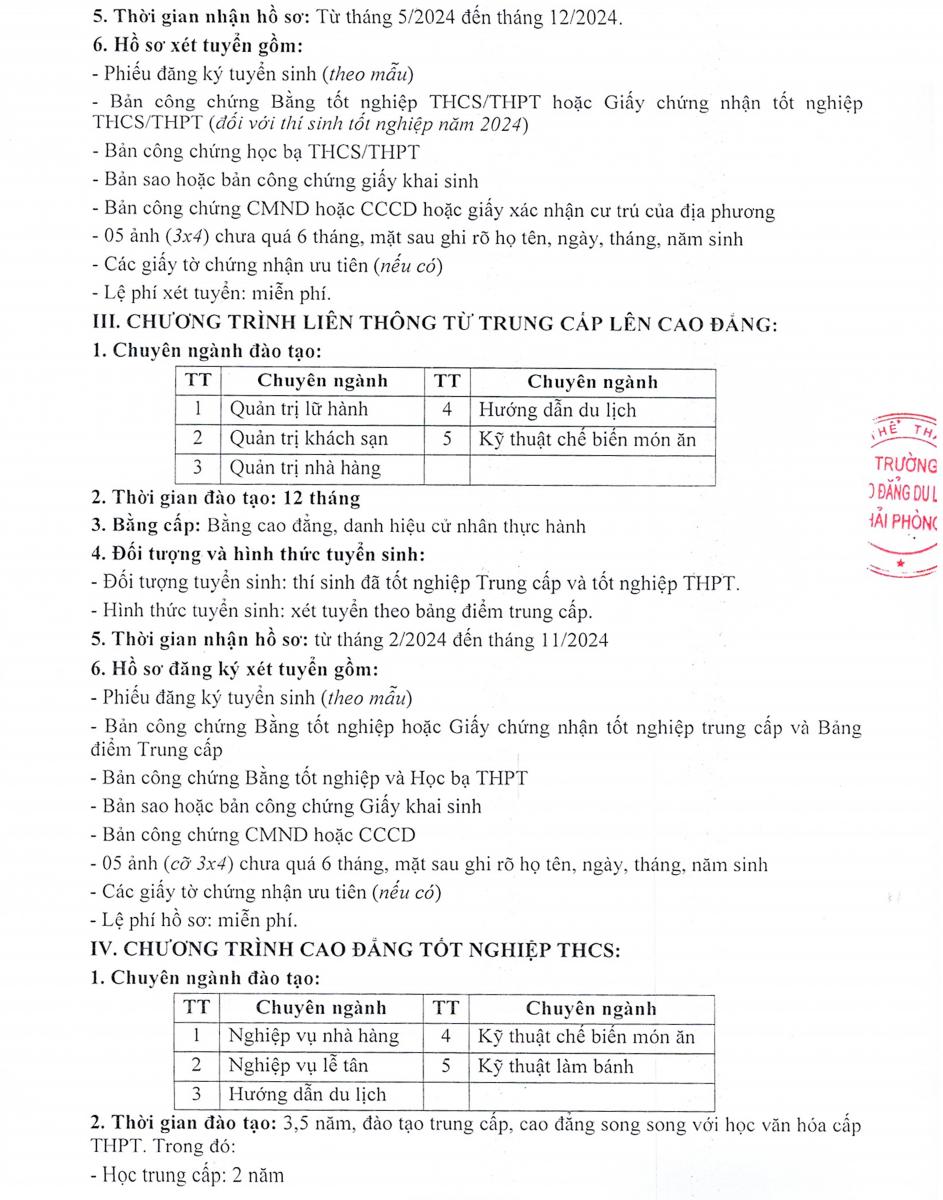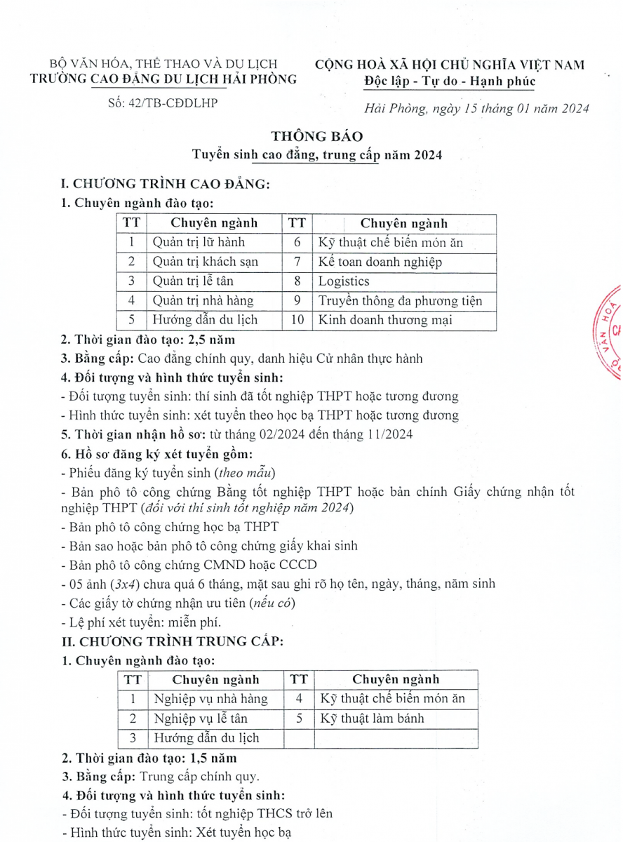 Ngày 15-01-2024, TRƯỜNG CAO ĐẲNG DU LỊCH HẢI PHÒNG - Trường trọng điểm quốc gia, đào tạo cấp độ quốc tế, công bố phương án tuyển sinh năm 2024. Theo đó, Nhà trường tuyển sinh 10 ngành đào tạo Trình độ Cao đẳng; 05 ngành liên thông trình độ Trung cấp lên Cao đẳng và 05 ngành đào tạo chương trình Trung cấp kết hợp với học văn hóa trung học phổ thông (THPT).