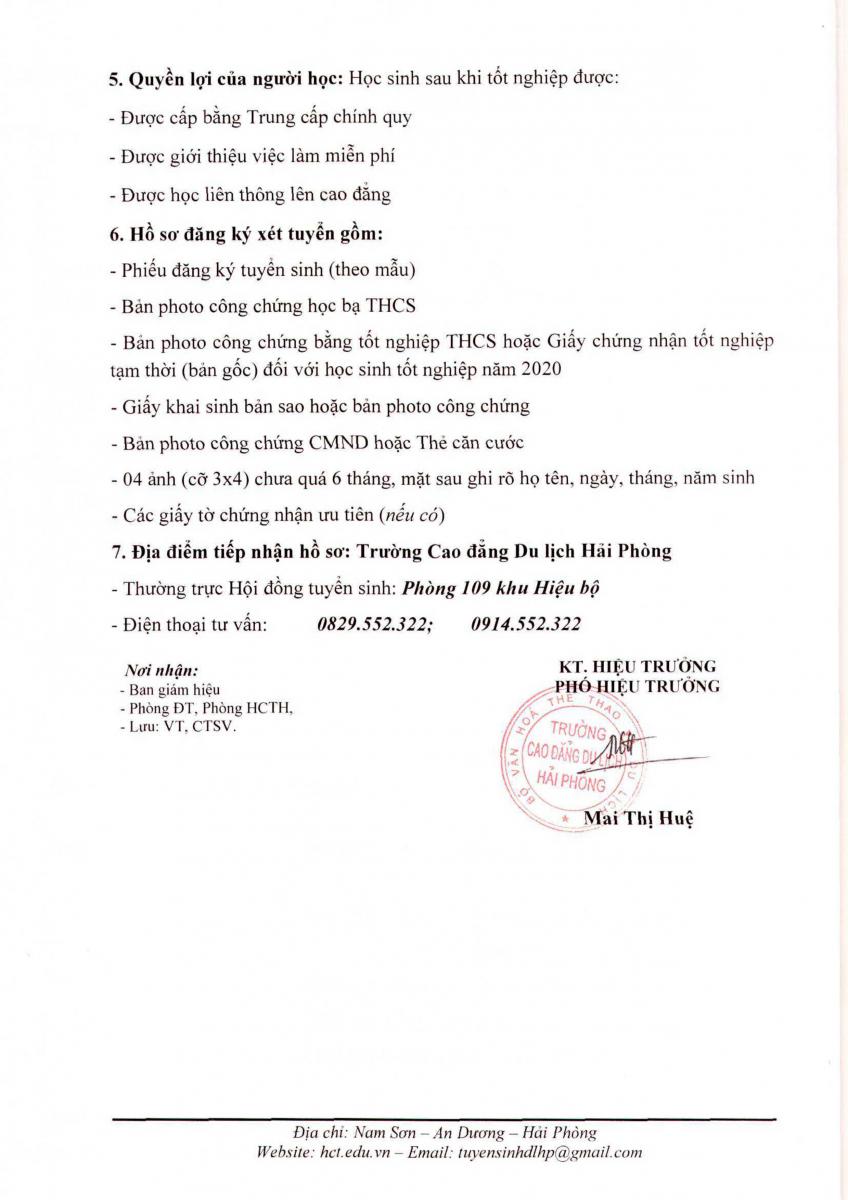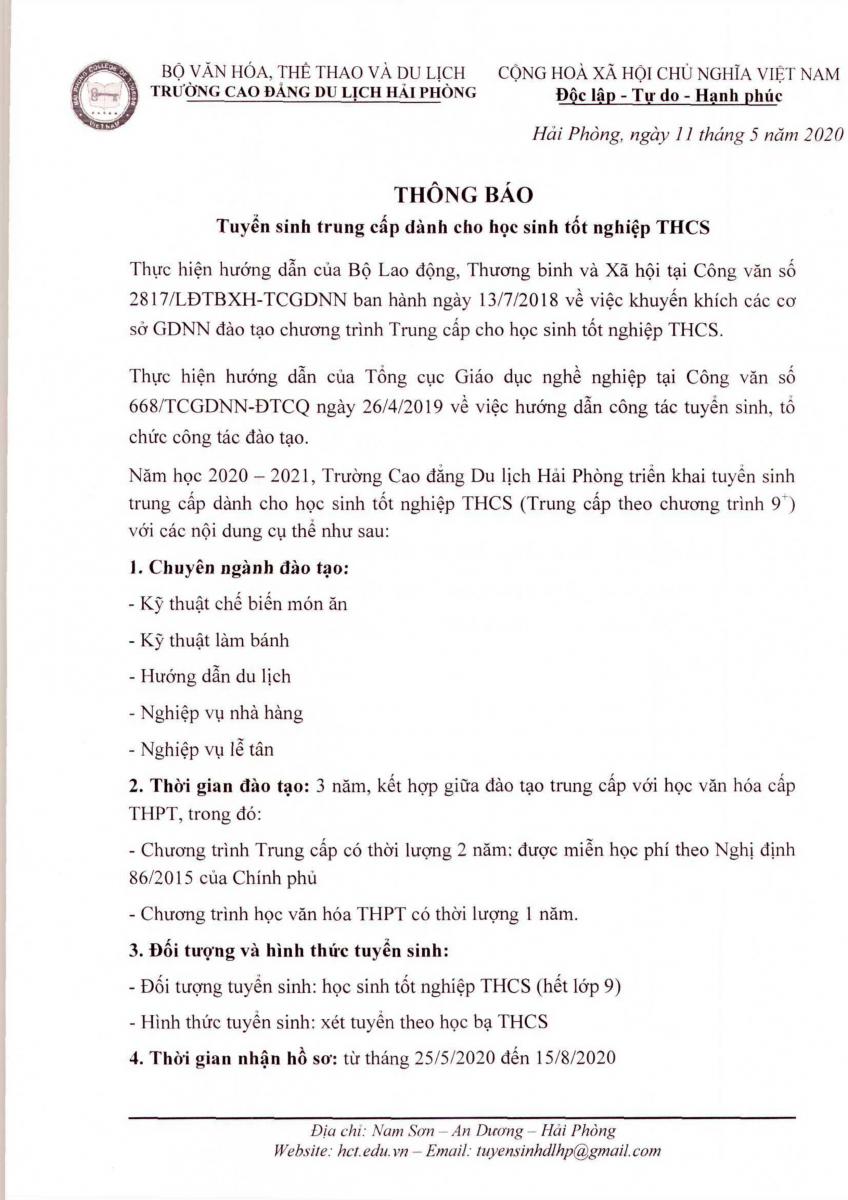 Trường Cao đẳng Du lịch Hải Phòng triển khai tuyển sinh Trung cấp dành cho học sinh tốt nghiệp THCS.
